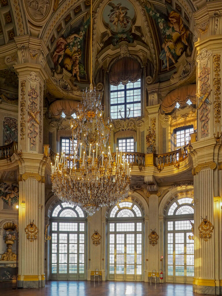 Le souci du détail du projet de Filippo Juvarra a rendu Stupinigi et son Pavillon de Chasse l’un des endroits les plus suggestifs aux alentours de Turin. Le cœur du complexe est représenté par le grand Salon Central de forme ovale à double hauteur, avec son incroyable dôme en forme de bateau renversé – surplombé à l’extérieur par la sculpture du cerf, symbole de Stupinigi – et les merveilleuses fresques trompe-l’œil sur le thème de la chasse réalisées entre 1731 et 1733 par les frères Domenico et Giuseppe Valeriani. L’intérieur est une magnifique expression du style Rococo italien, avec des laques et des stucs dorés, des précieux éléments de décor, des œuvres de l’artiste Bonzanigo, sculpteur préféré de la cour savoyarde, et les travaux en bois de Pietro Piffetti, le plus grand ébéniste de l’époque.