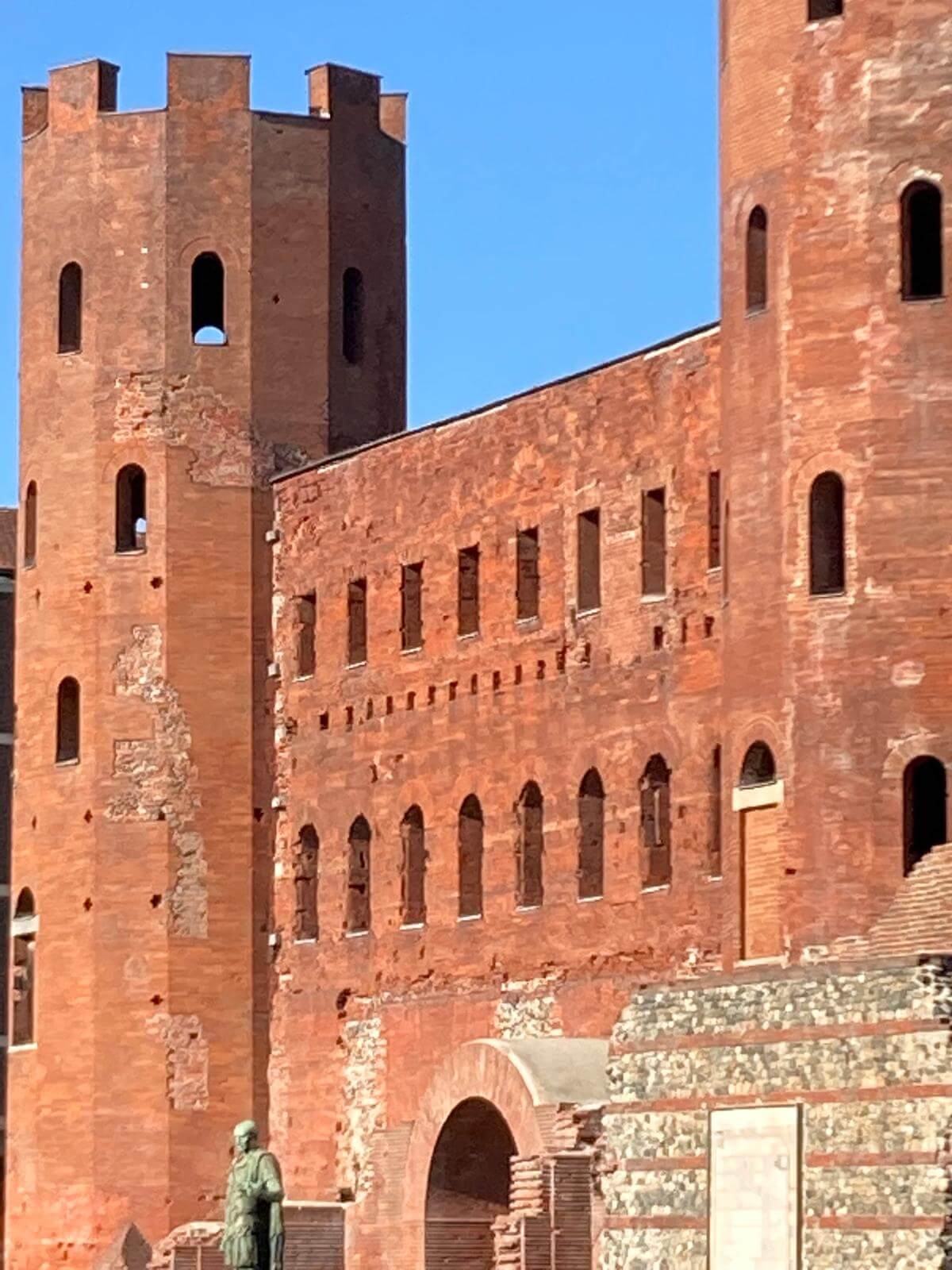 La ville de Turin est entrée dans l’Histoire comme colonie romaine, vers 27 av. J.-C., sous le nom d’«Augusta Taurinorum», sa fondation faisait partie des plans romains d’organisation administrative et logistique du Piémont récemment conquis. La colonie, au pied des principaux cols alpins et à l’extrémité occidentale de la plaine du Pô, devait être l’avantposte romain vers les Gaules, au croisement des principales voies de communication vers le monde transalpin. La structure d’origine de la Porte Palatine est encore reconnaissable en dépit des modifications qu’elle a subies au fil des siècles.