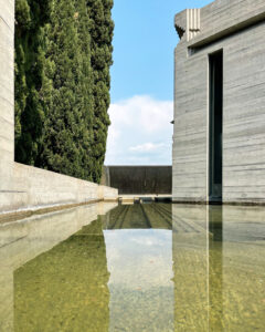 A la mort de l’entrepreneur Giuseppe Brion – fondateur de l’agence de design italienne Brionvega – son fils Ennio confie à l’architecte Carlo Scarpa la réalisation de ce vaste complexe de 2000 m². Sur ce terrain en forme de L, Carlo Scarpa conçoit et relie plusieurs bâtiments et espaces : une chapelle, un pavillon de méditation, un bassin, une prairie, une rangée de cyprès. L’architecture de Carlo Scarpa est caractérisée par une grande finesse des détails et un mélange inattendu et pourtant harmonieux des matériaux et des formes.